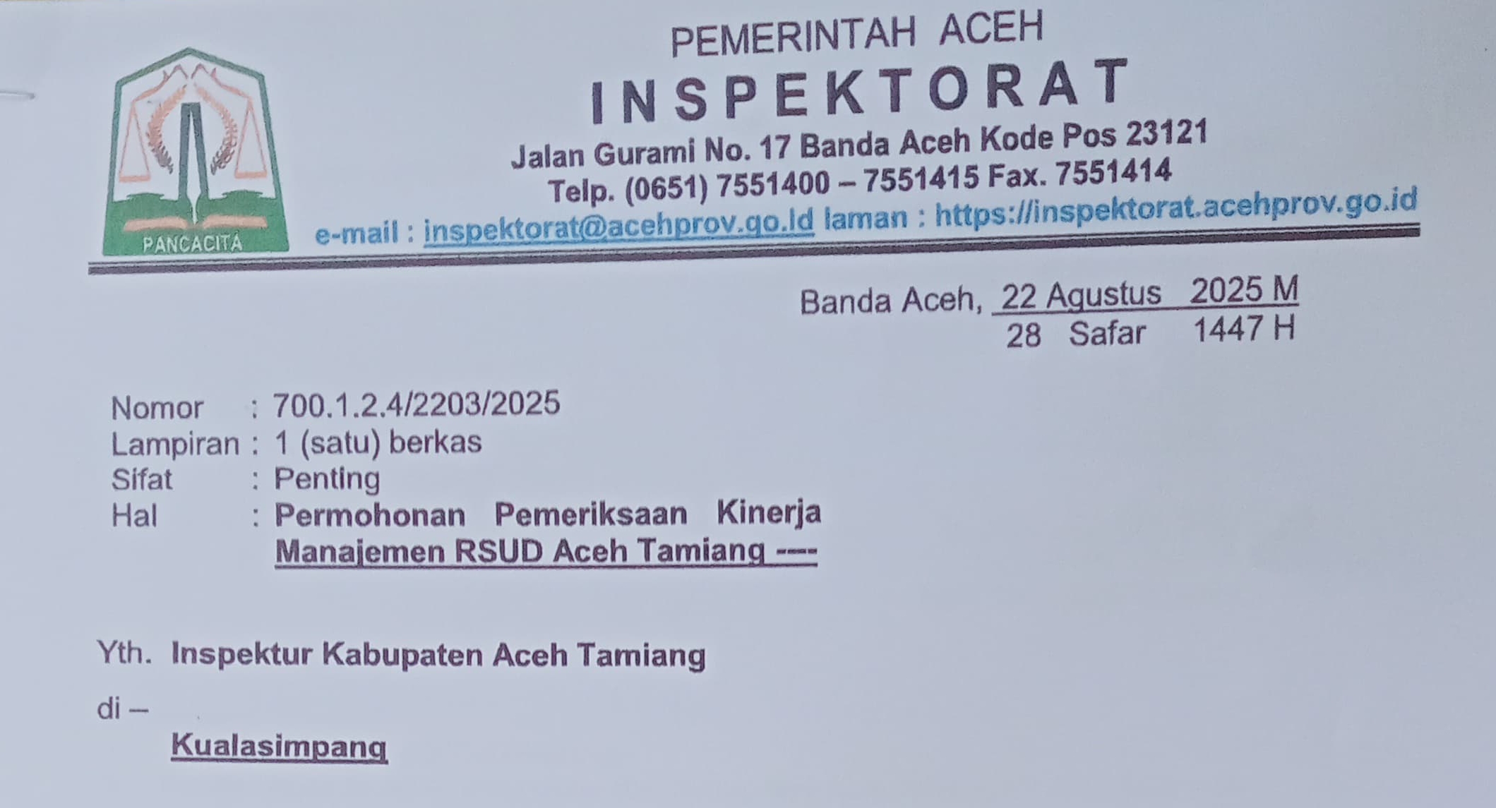 Banda Aceh, Acntimes.id – Inspektorat Aceh resmi mengirimkan surat kepada Inspektur Kabupaten Aceh Tamiang untuk menindaklanjuti aduan masyarakat yang disampaikan oleh LSM Pandora Muda Sedia terkait lemahnya manajemen dan pelayanan di RSUD Aceh Tamiang. Surat dengan nomor 700.1.2.4/2203/2025 itu diteken langsung oleh Plt. Inspektur Aceh, Ir. Abdullah, ST., CFrA.